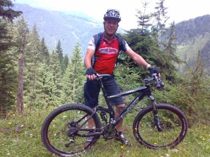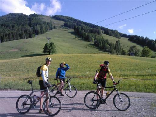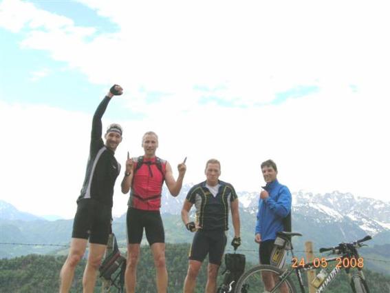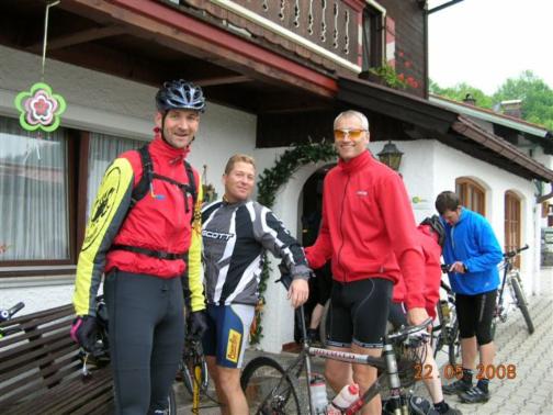 Leider fuhren jetzt am nächsten Morgen wieder ein paar von uns nach Hause. Somit blieben für den Samstag und die anstehenden 1658 Höhenmeter bei 58 Kilometer dann nur noch Franki, Pilli und Horni über. Horny ist ja häufiger in Reit im Winkl und hat dort auch ein paar Freunde. Sein bester Freund dort ist der Gerhard. Gerhard ist ein Tier und kennt alle Strecken im dortigen Bereich. Er hat sich Kurzerhand für die Führung der letzten Tour zur Verfügung gestellt. Also sind wir dann bei strahlendem Sonnenschein losgefahren. Es ging zunächst bergab nach Kössen um dann die Priener Hütte auf einer Höhe von 1410 Hm zu erklimmen.