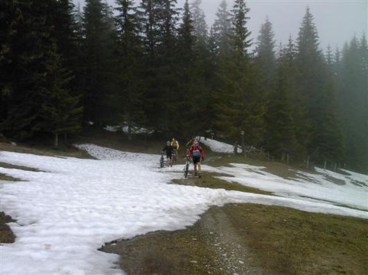 Es war nicht möglich die matschigen Schneepassagen der letzten 100 Höhenmeter ohne vom Rad zu steigen zu schaffen.