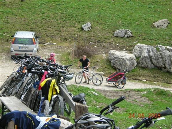 Ja, was ihr dort seht ist Wirklichkeit. In dem Anhänger sitzen 2 kleine Kinder. Wir haben ihn überholt, aber er ist den gleichen Weg zur Hütte hochgefahren wie wir. Respekt!